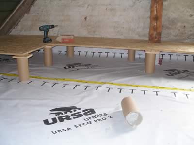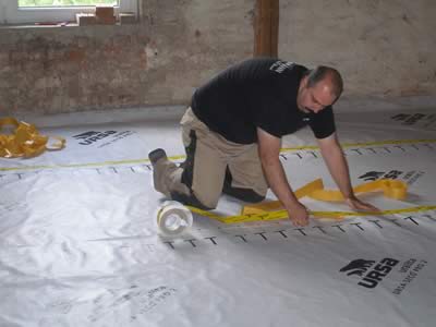 Auslegen und luftdichtes verkleben einer Dampfbremsfolie auf einer Obersten Geschoßdecke.